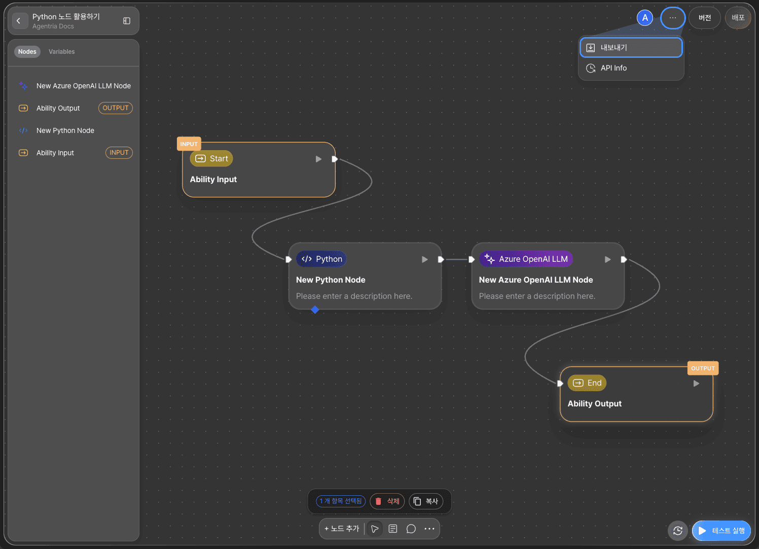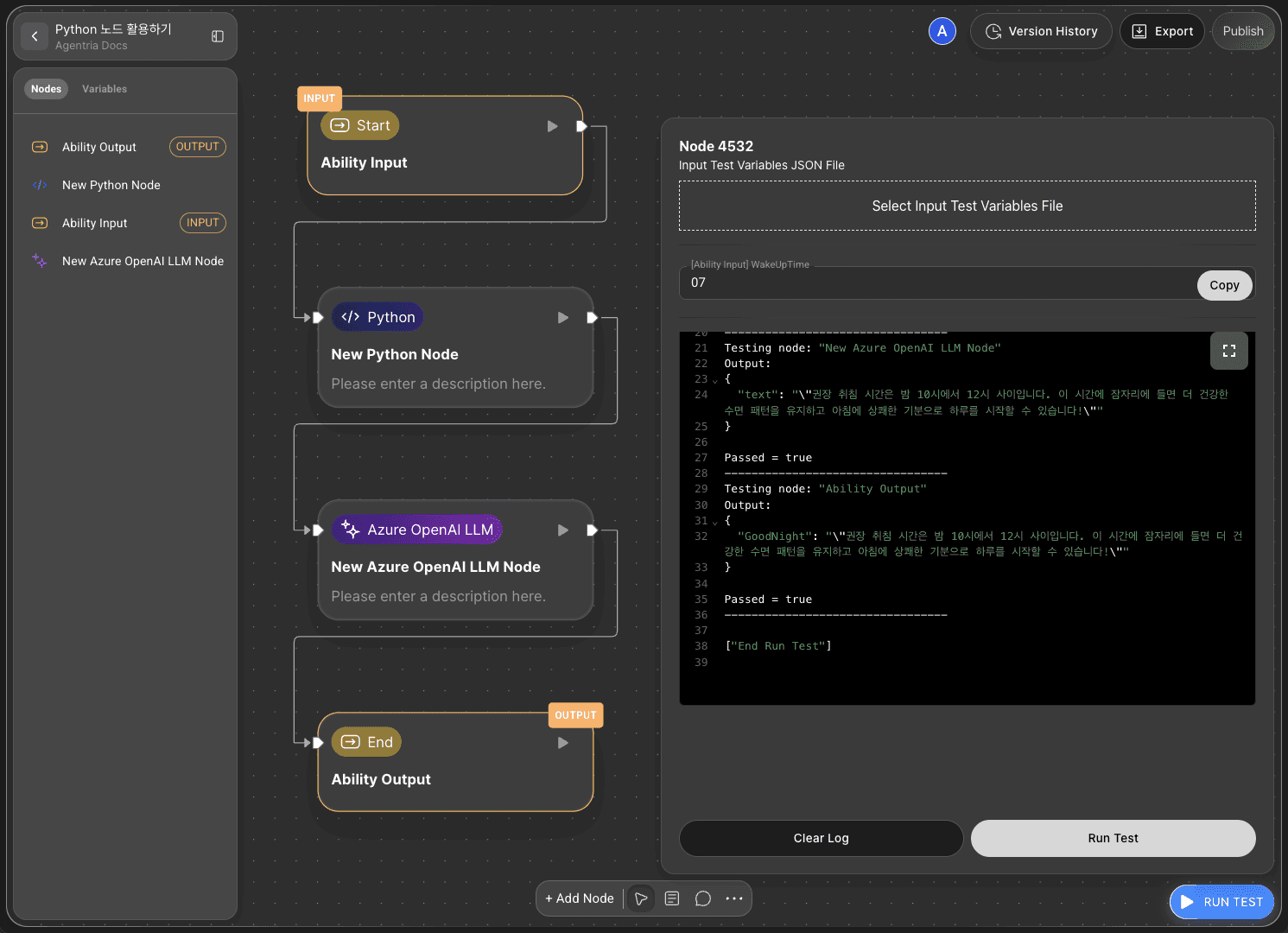 테스트 실행(RUN TEST)를 클릭하고테스트 실행(Run Test)를 클릭하여 워크플로 전체를 실행할 수 있습니다.세부 사용법은 어빌리티 테스트 페이지를 참고하세요.