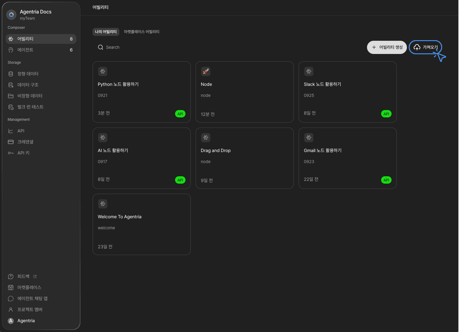 가져오기(Import)버튼을 통해 JSON 파일 형태의 어빌리티를 업로드할 수 있습니다.
