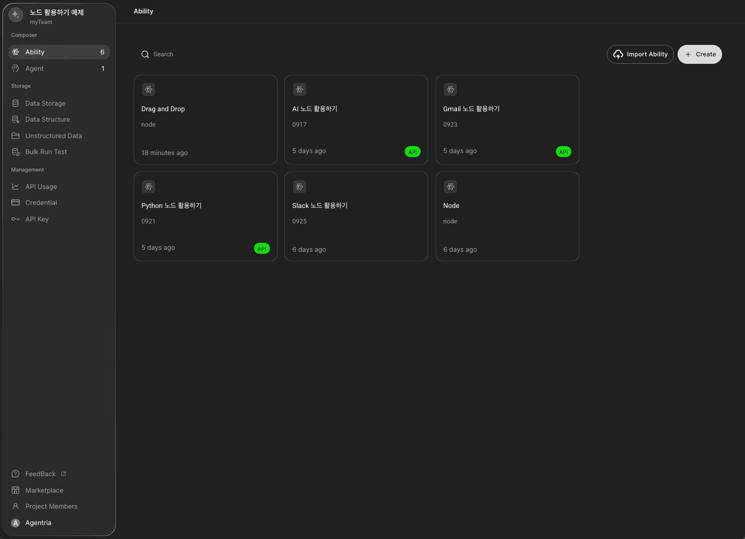 어빌리티(Ability)는 프로젝트 내에서 독립적인 워크플로(Workflow) 단위로 생성 및 편집됩니다.