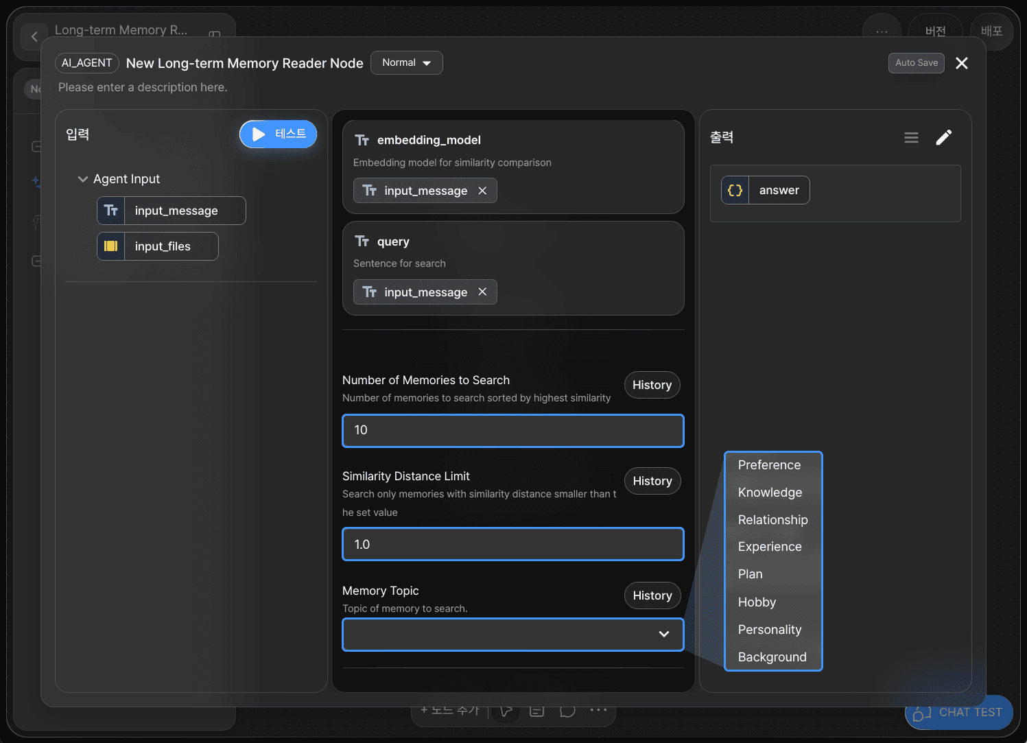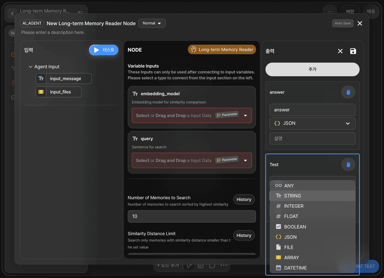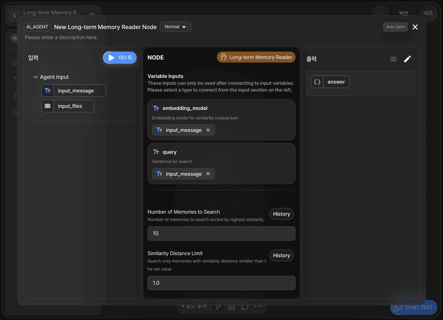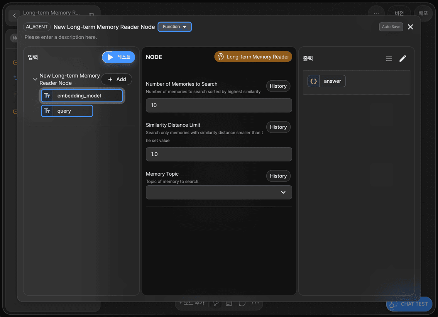 장기 기억 판독 노드는 유사도 비교를 위한 임베딩 모델(embedding_model)과 검색을 위한 쿼리(query) 어댑터 변수를 가지고 있습니다.