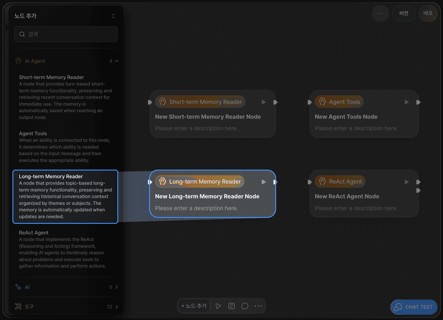 장기 기억 판독(Long-term Memory Reader) 노드는 여러 세션(Session)에 걸쳐 대화 기록이나 경험을 주제별로 저장하고 불러오는 장기 기억 기능을 제공하는 노드입니다.