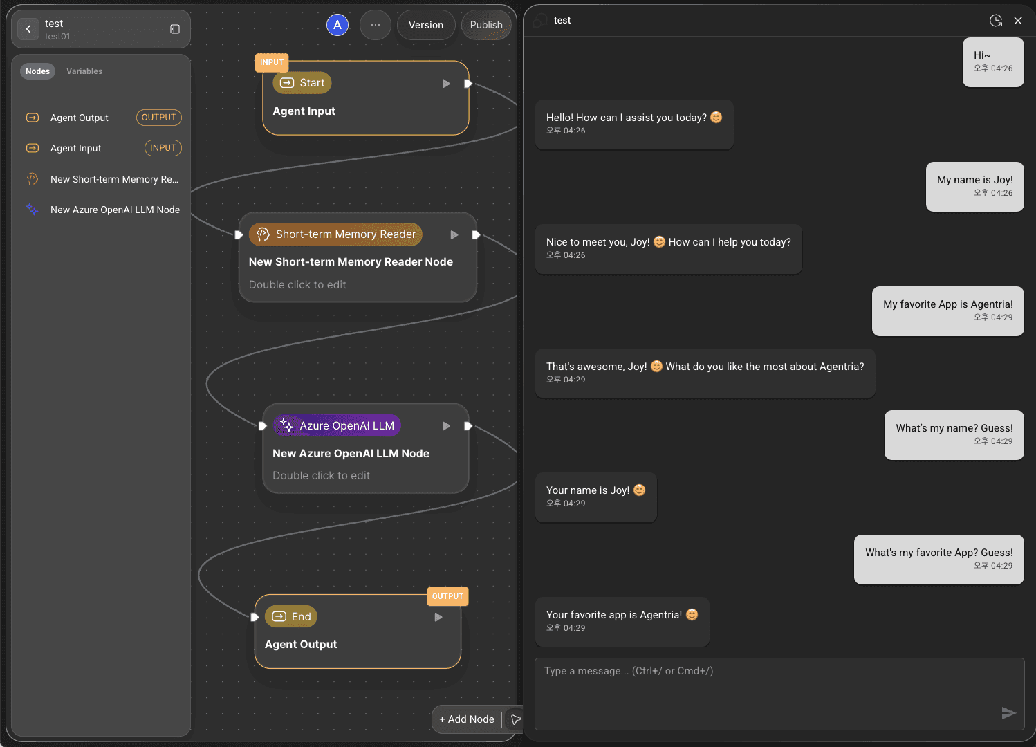 Once your Agent workflow is complete, you can run the entire logic and evaluate its performance through a chat-based format.