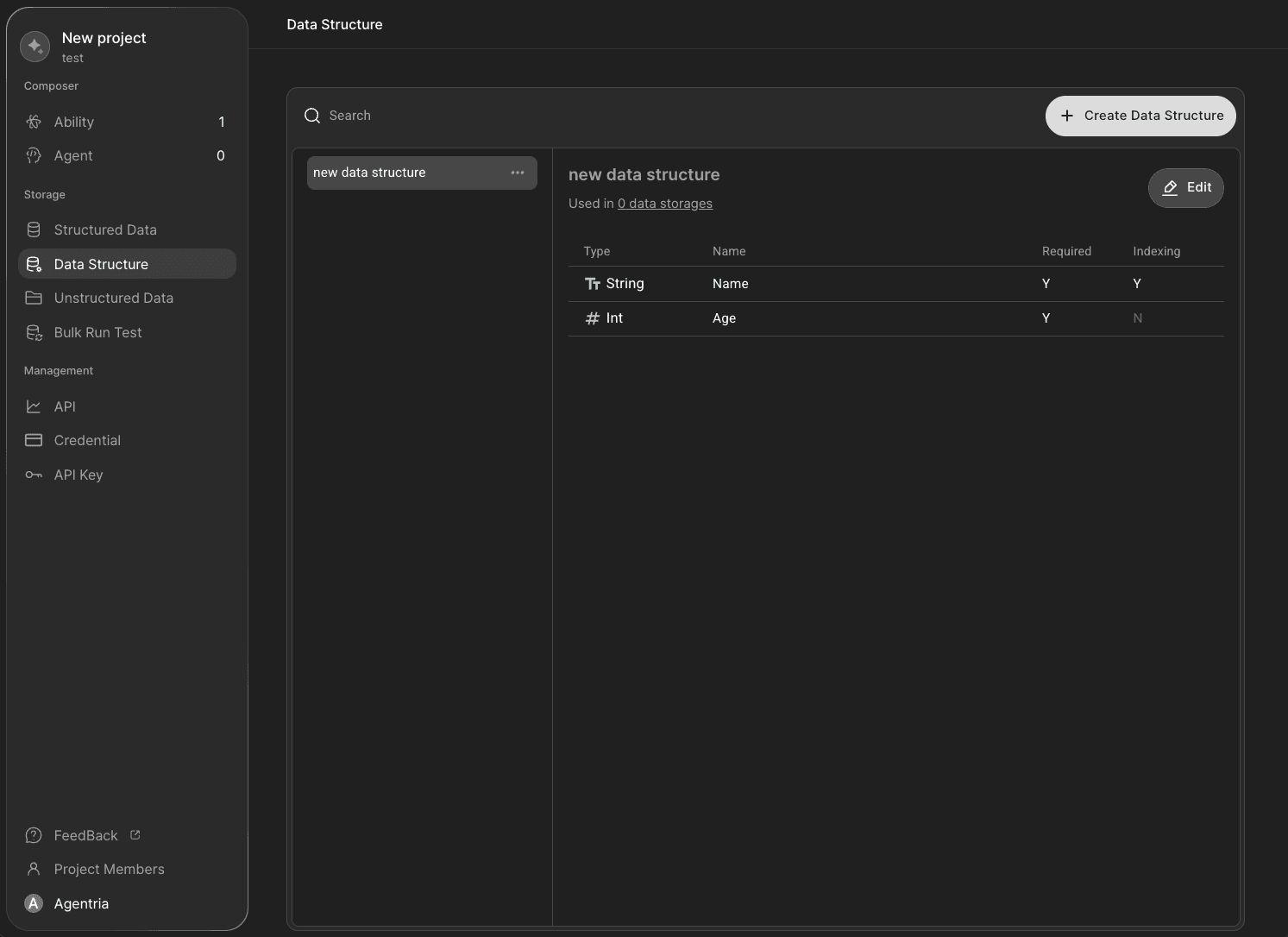 The completed structure displays the number of storages it’s currently used in (e.g., Used in 0 data storages).