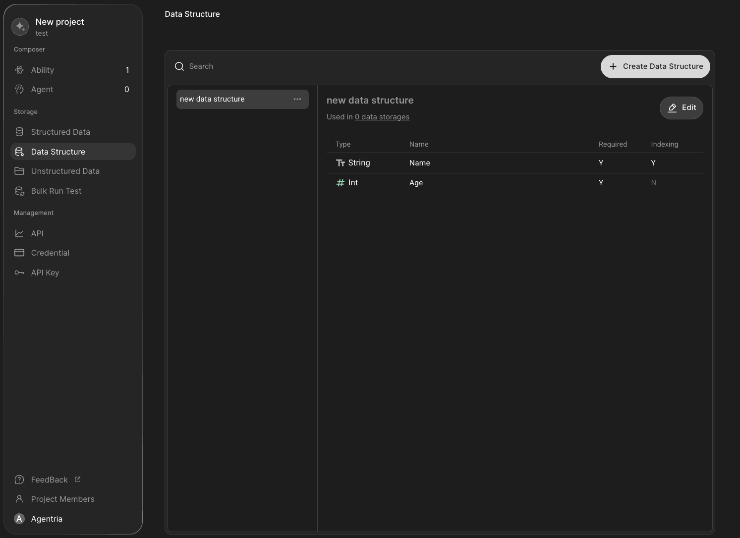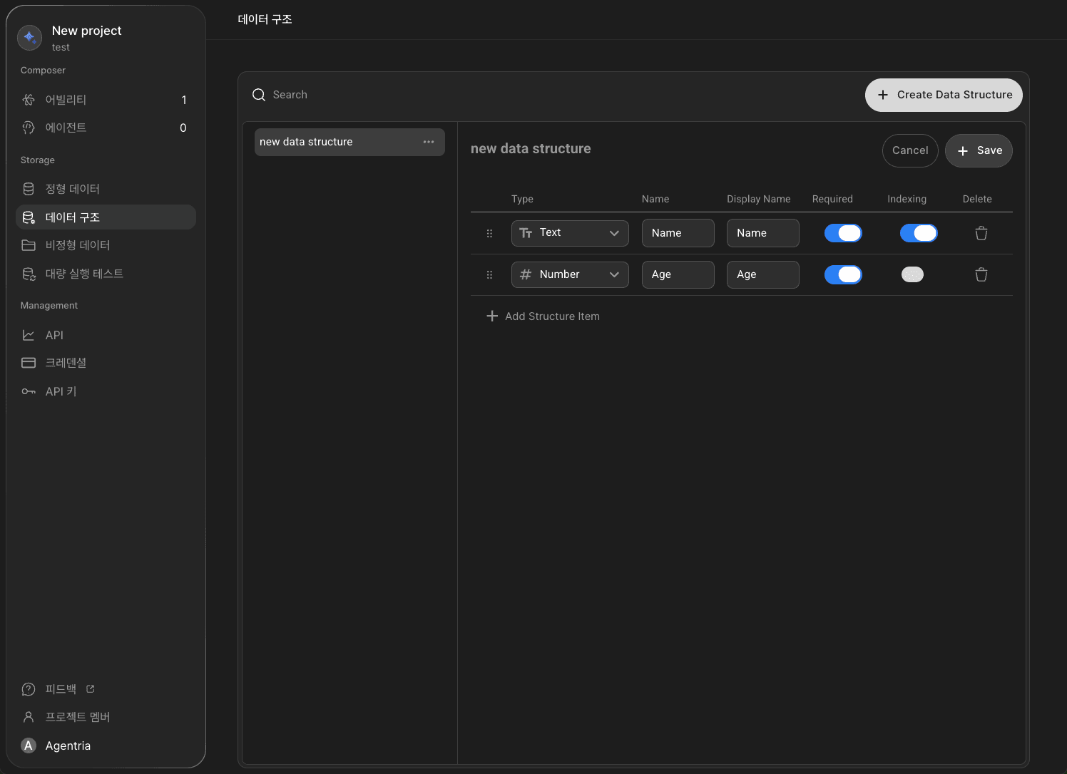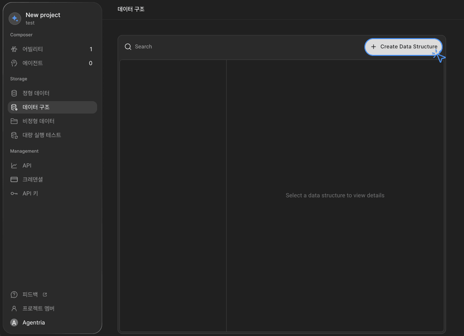 +Create Data Structure버튼을 클릭하여 새 구조를 생성합니다.