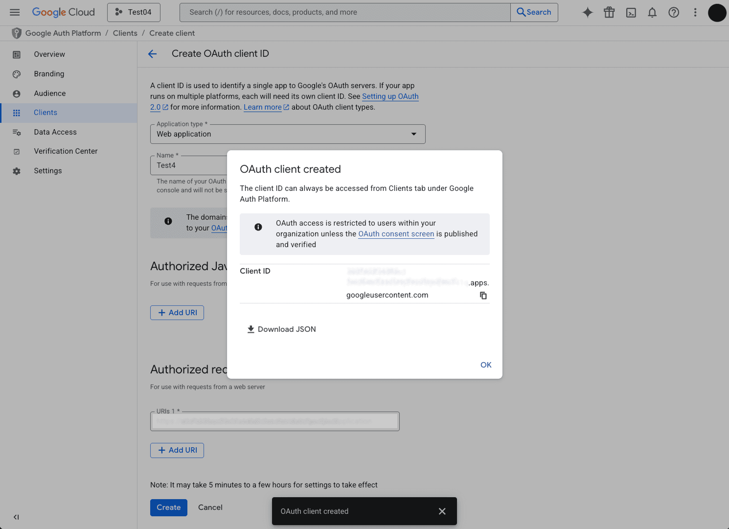 During this process, your Client ID and Client Secret will be displayed — make sure to copy and store them in a secure location.