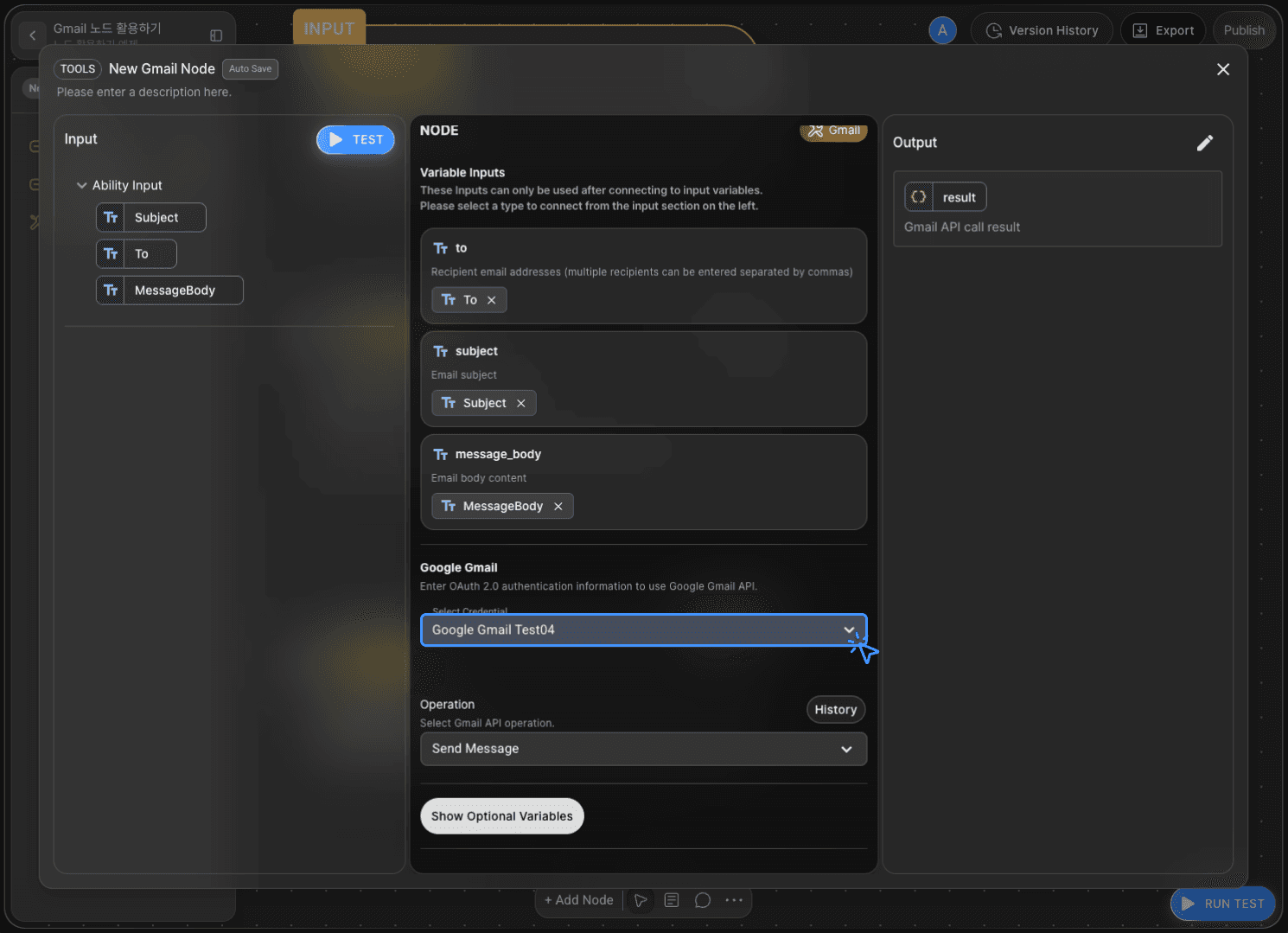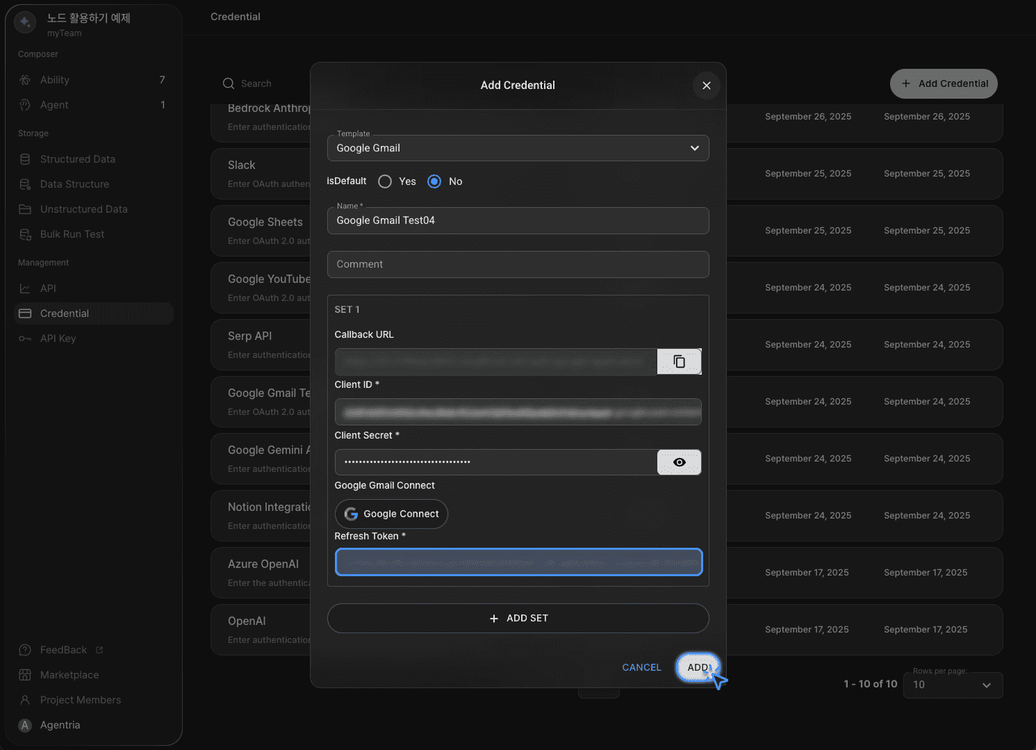 To use Google nodes such as Gmail, Google Sheets, and Google Calendar, you must first issue Google credentials and register them in Agentria.