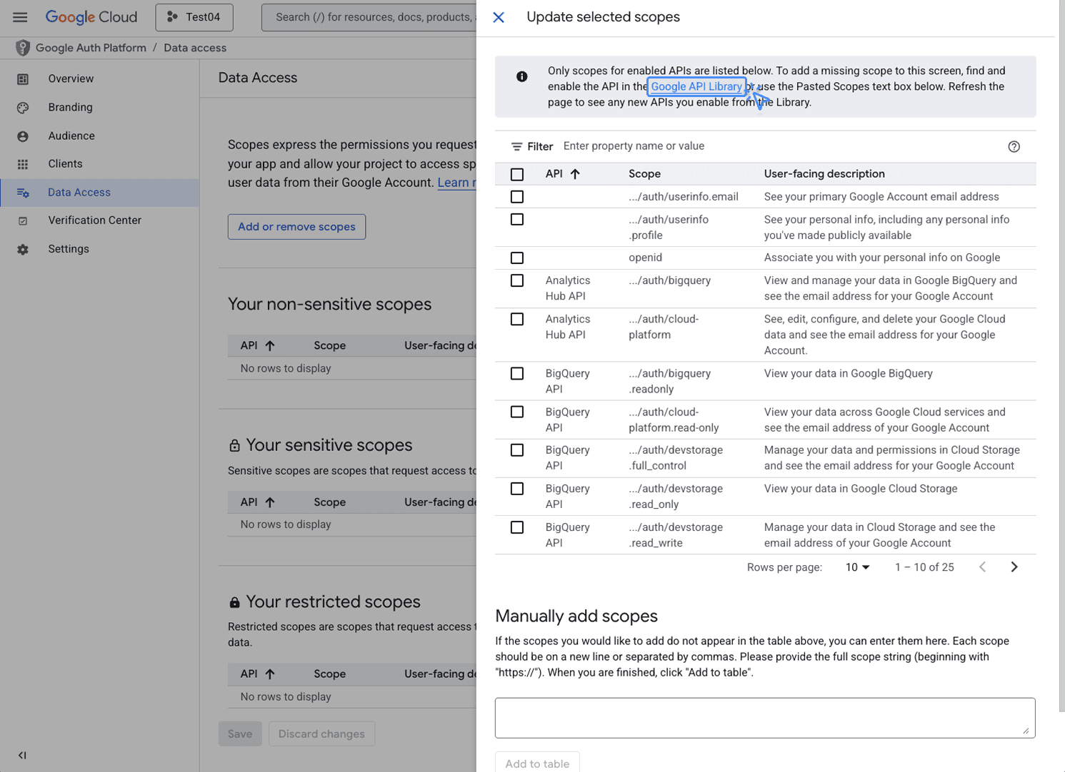 Click Add or Remove Scopes. Then follow the link to the Google API Library.