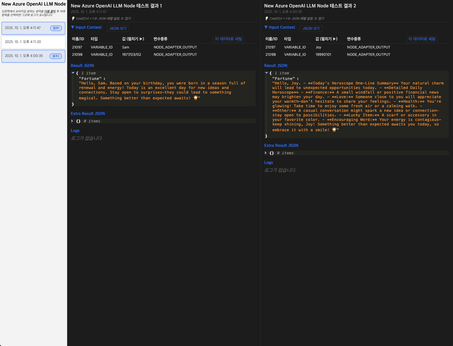 테스트 기록(History)버튼을 클릭하면, 실행한 각 노드 테스트의 입력값, 결과, 로그 등을 확인할 수 있습니다.결과 비교 : 여러 테스트 결과를 한 화면에서 비교할 수 있습니다.