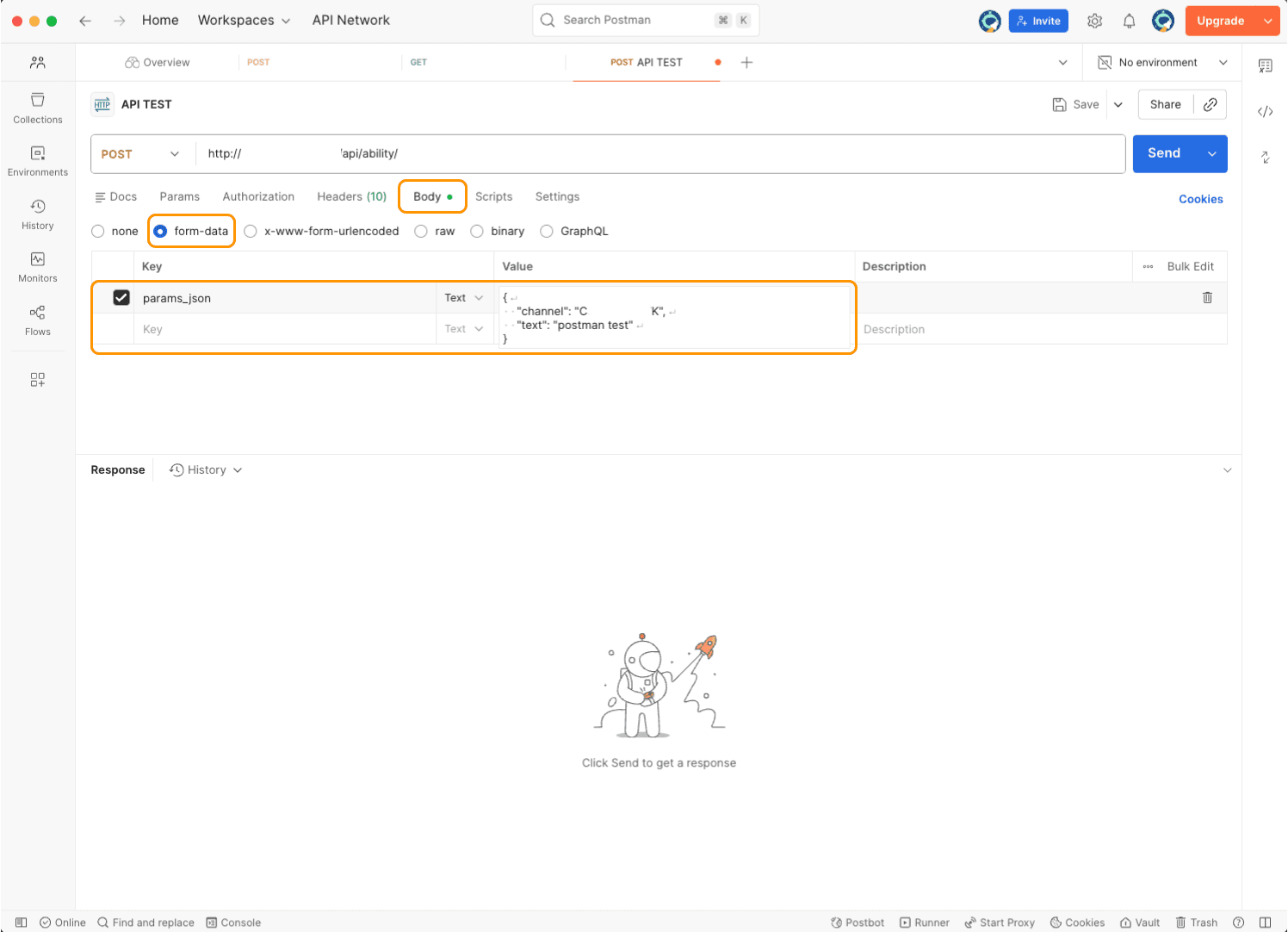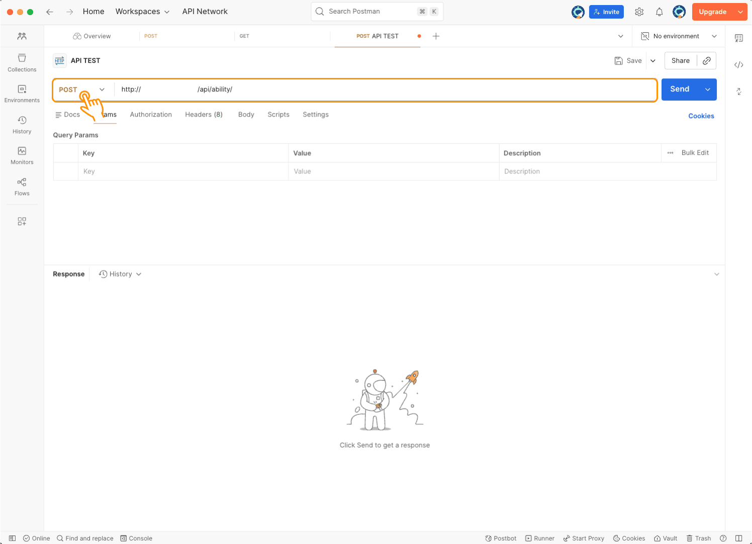 To request an action from the server, set the method to POST and enter the endpoint URL.
