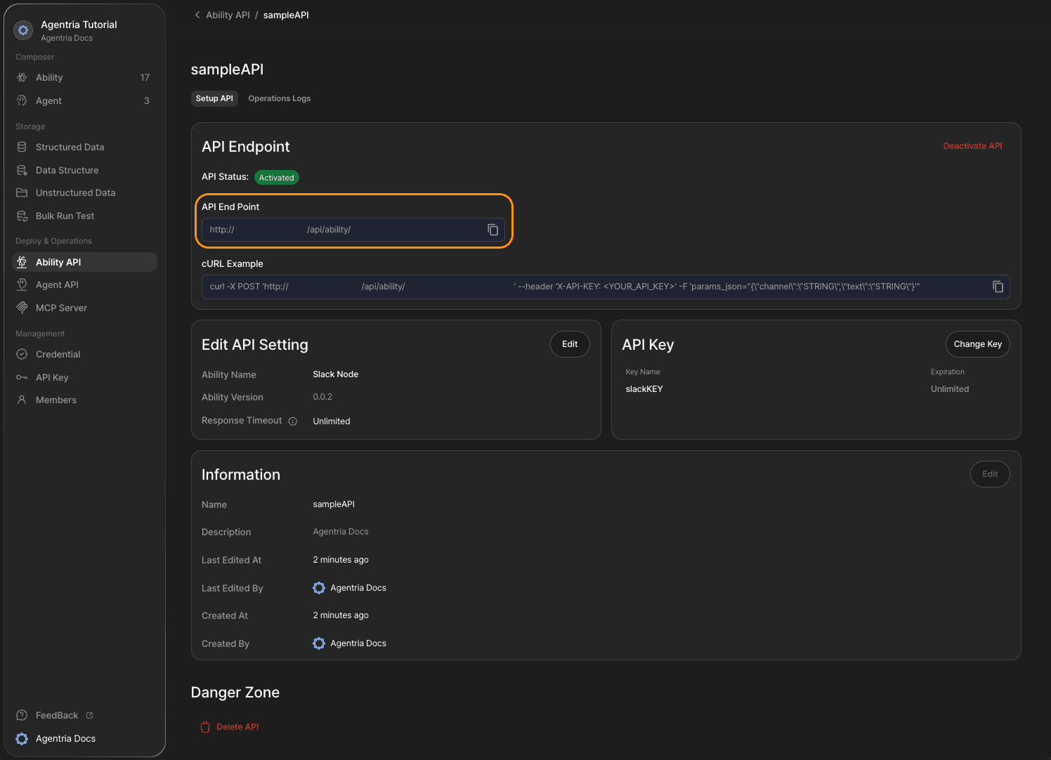 You can find API endpoints in Agentria’s Ability/Agent API tab.