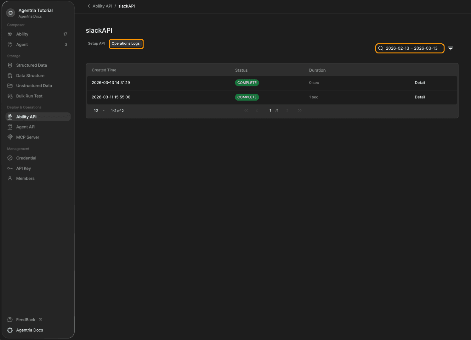 You can check call details in the logs under Agentria’s API tab.