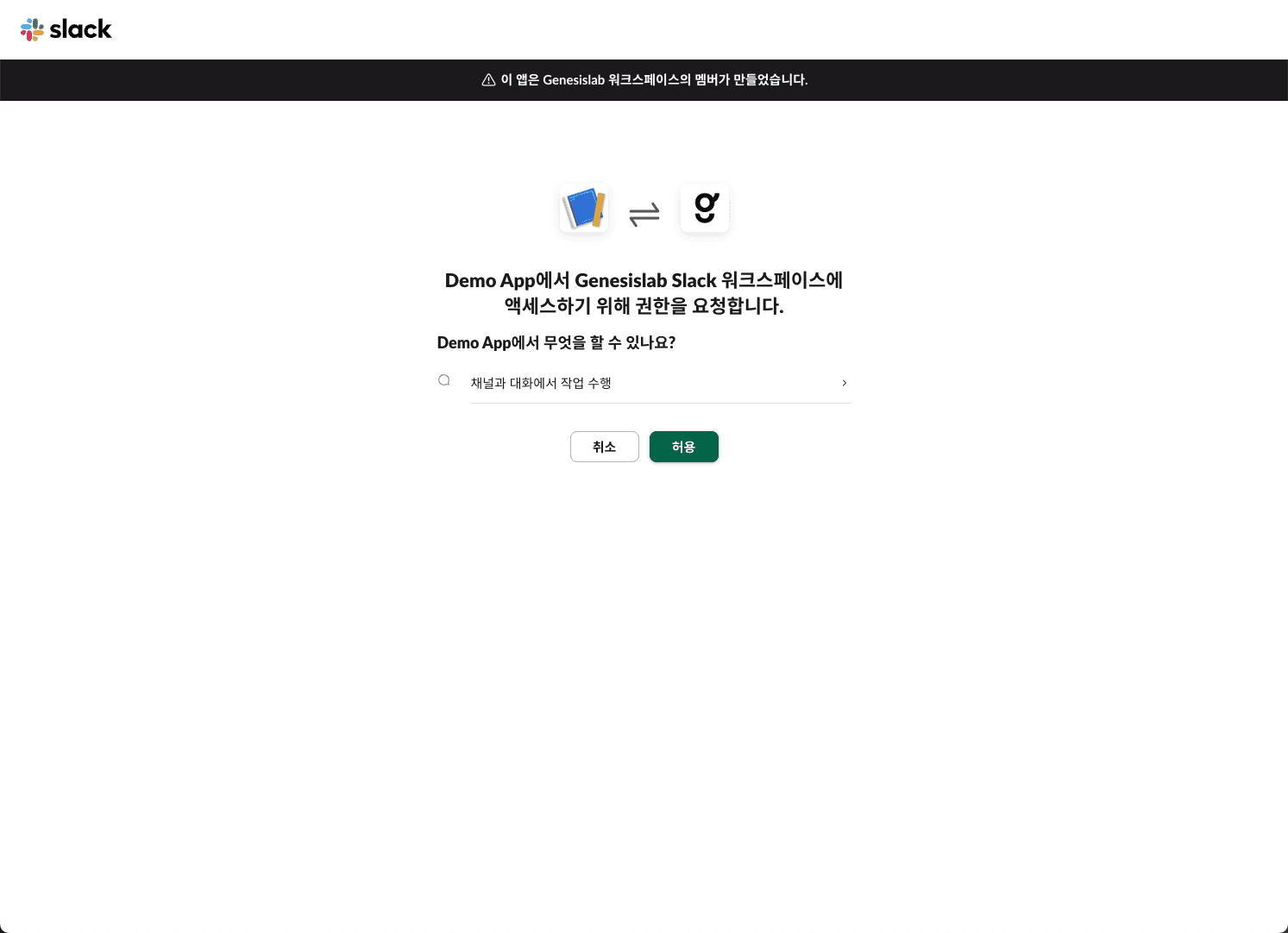 슬랙 워크스페이스 접근 권한을 허용합니다.