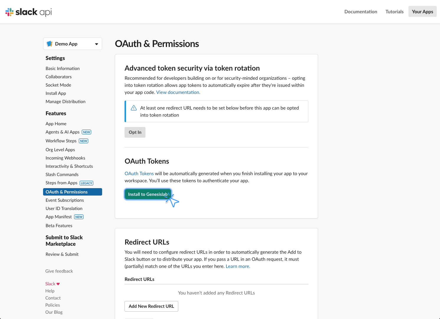 다음 과정을 진행하여 워크스페이스에 OAuth 토큰 설치 버튼을 활성화할 수 있습니다.