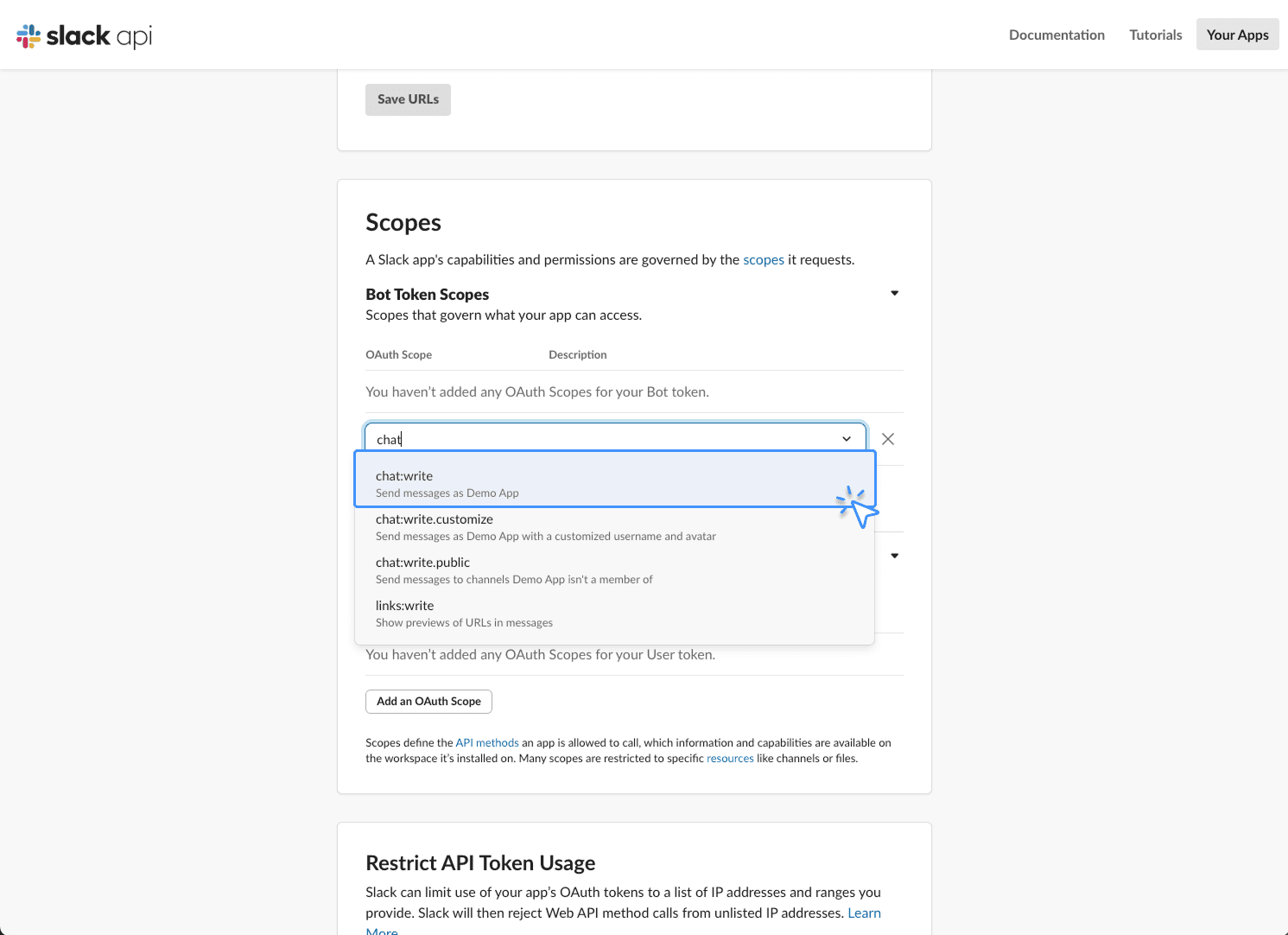입력창에 chat이라고 작성한 후 chat:write를 선택합니다.