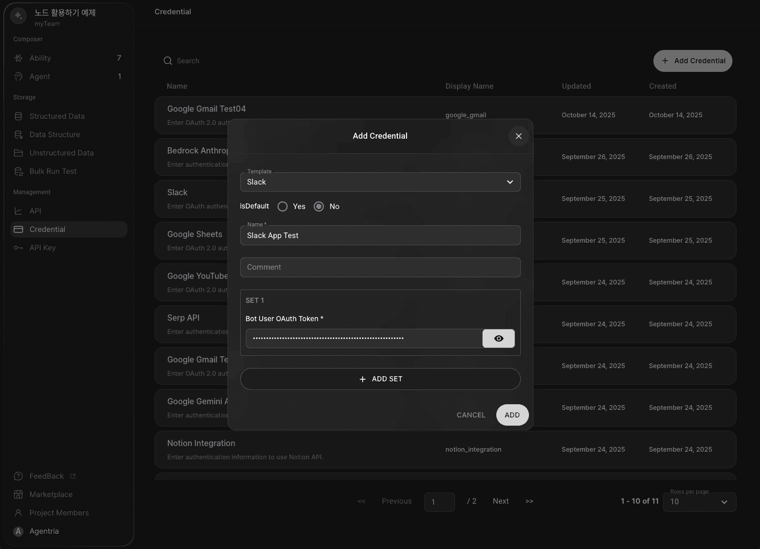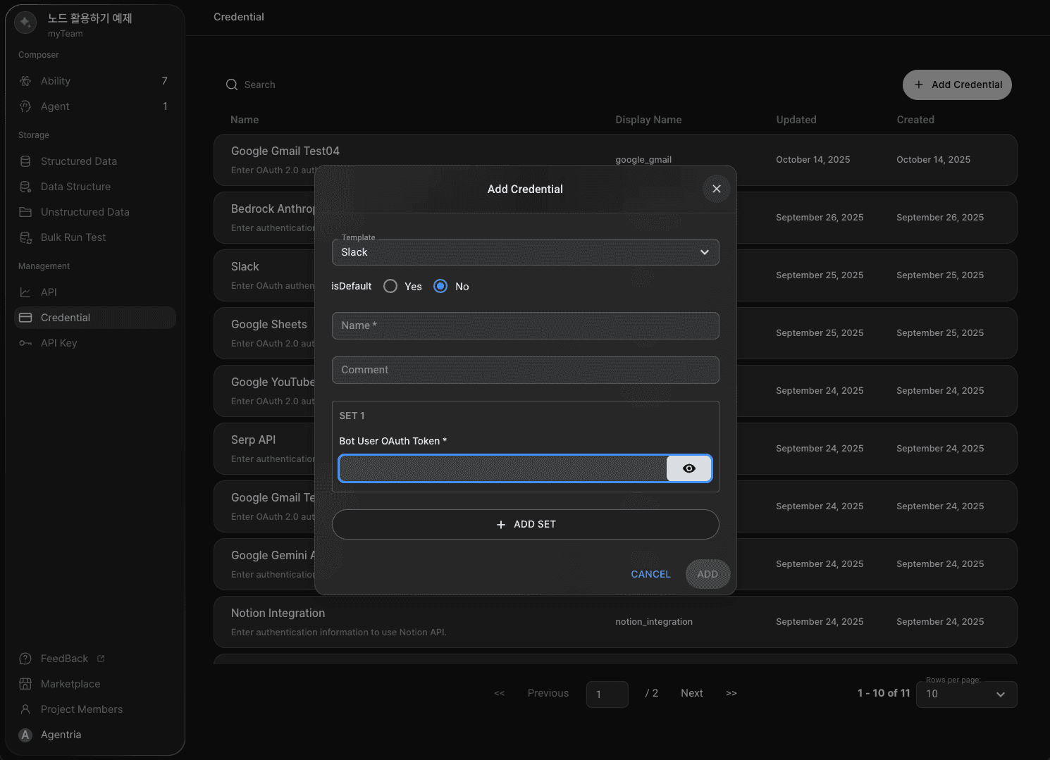 Slack 노드를 사용하려면 슬랙 크리덴셜을 발급한 후에 Agentria에 등록해야 합니다.