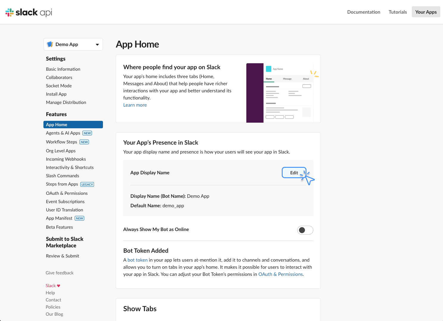 사이드바에서 앱 홈(App Home)으로 이동합니다.