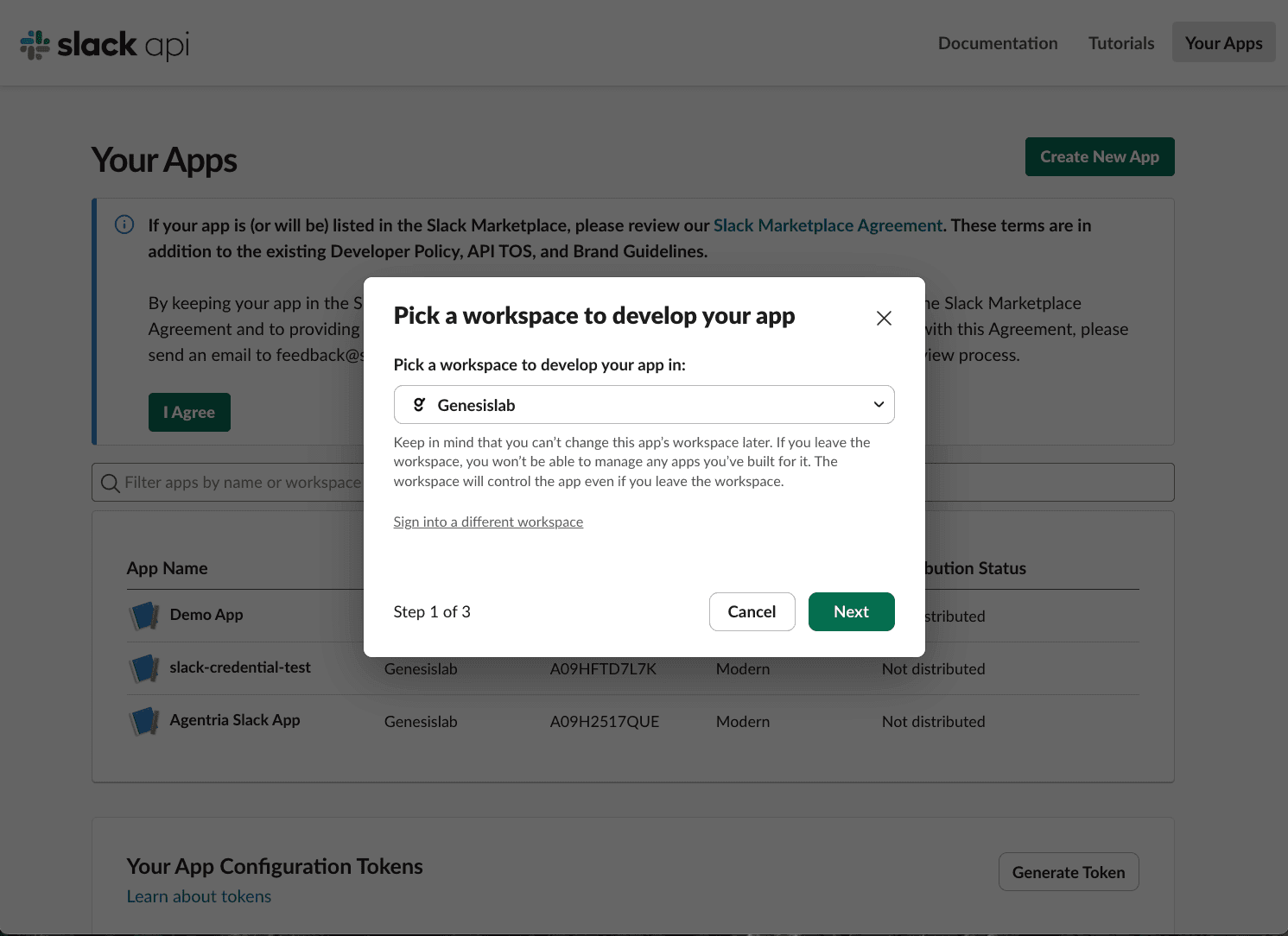 앱을 생성할 슬랙 워크스페이스를 선택합니다.