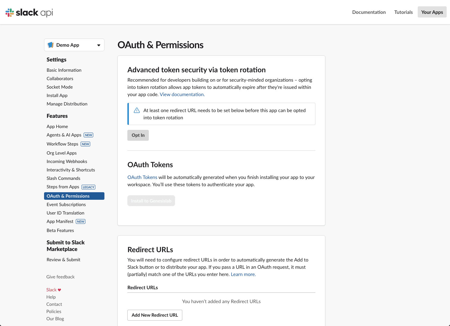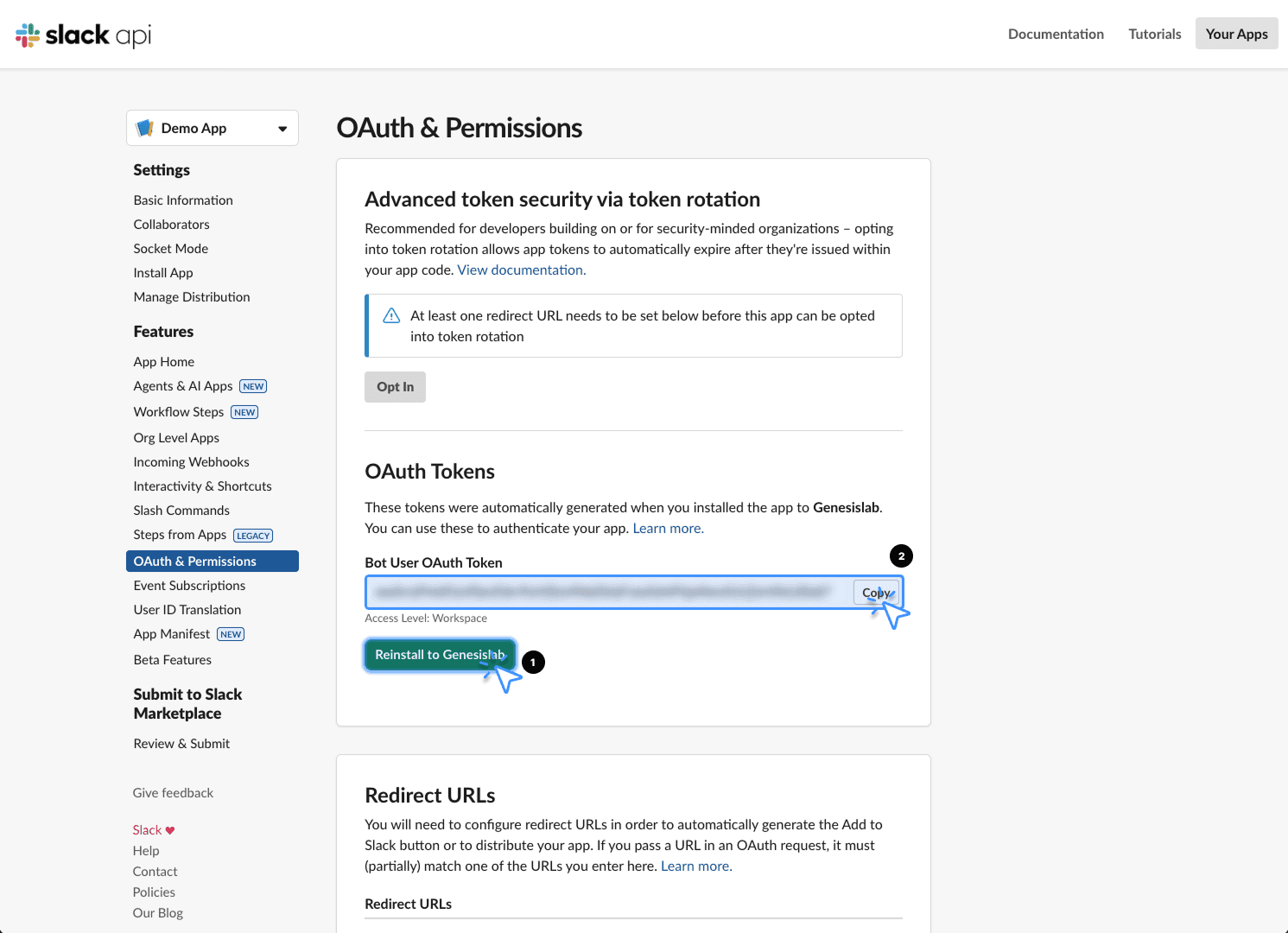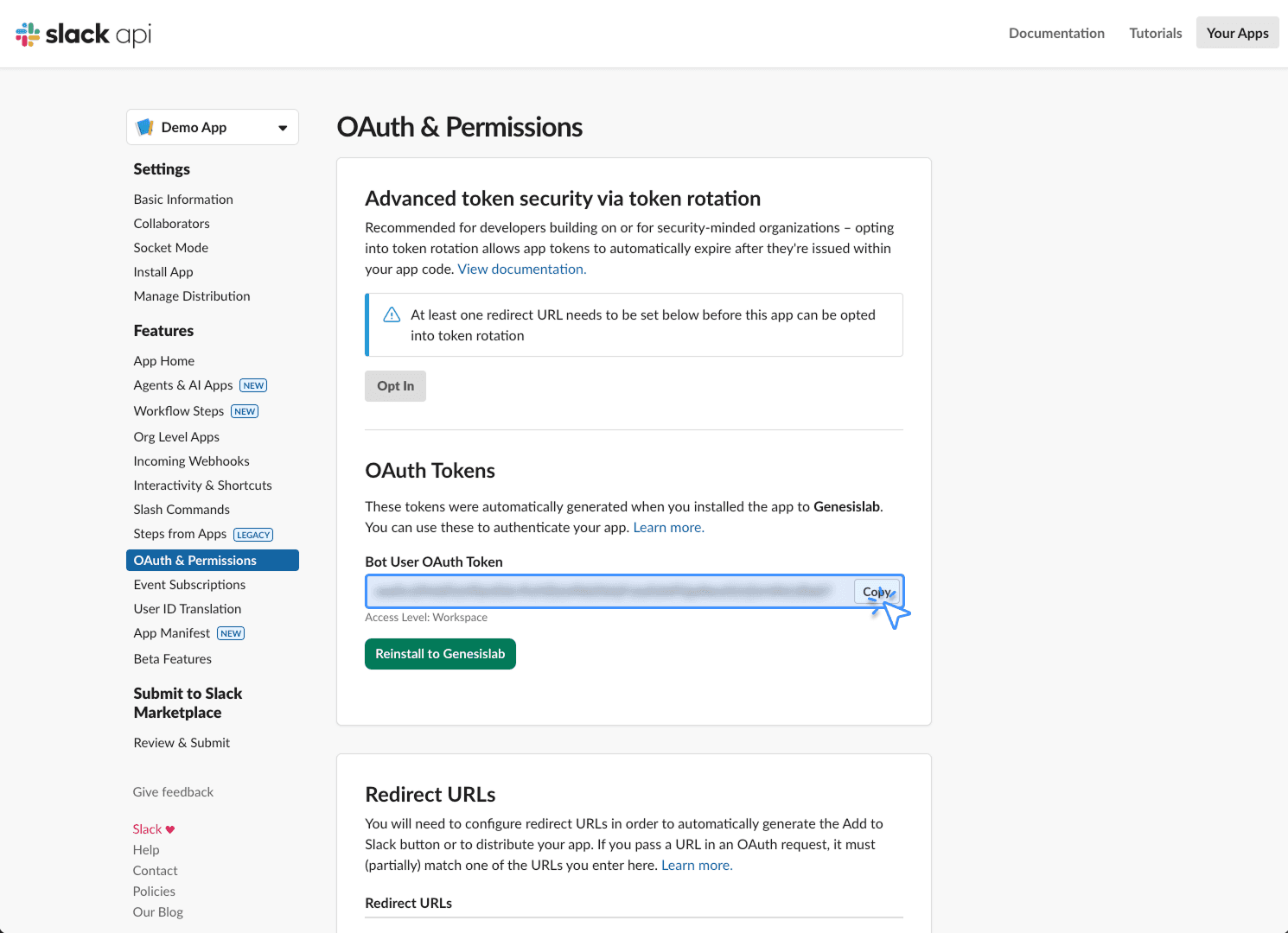 앱을 편집했다면 OAuth 및 권한 탭에서 OAuth 토큰을 다시 설치해야 합니다.